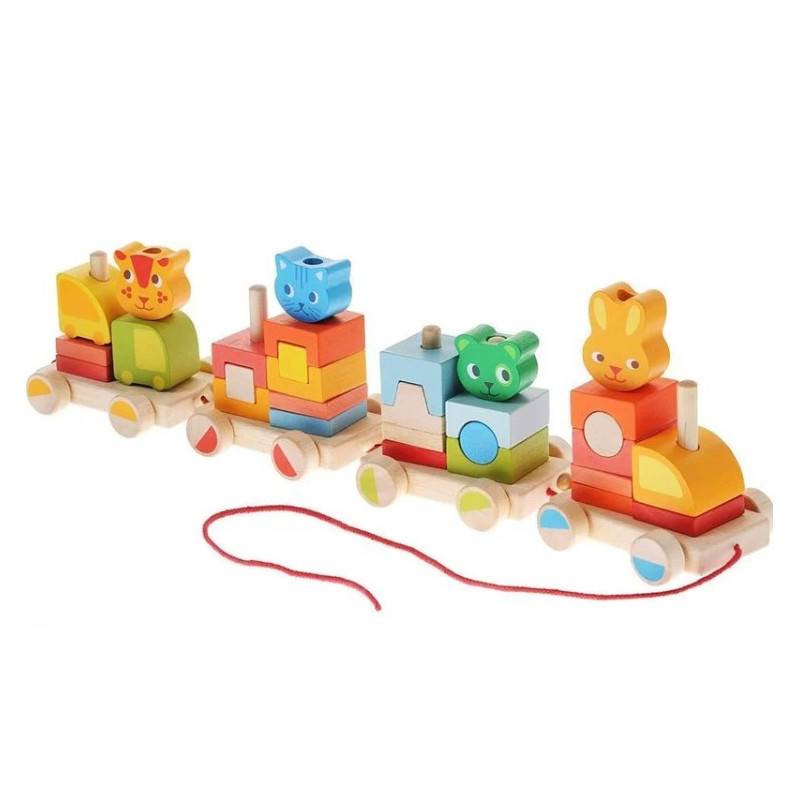 Un train coloré en bois que l’enfant assemble et décore selon son imagination. Quatre wagons à attacher, et des picots sur lesquels l’enfant glisse des pièces en bois colorées et illustrées. Il choisit les pièces qu’il souhaite pour créer de drôles de passagers. Une fois assemblé, l’enfant promène son train à l’aide du lacet.