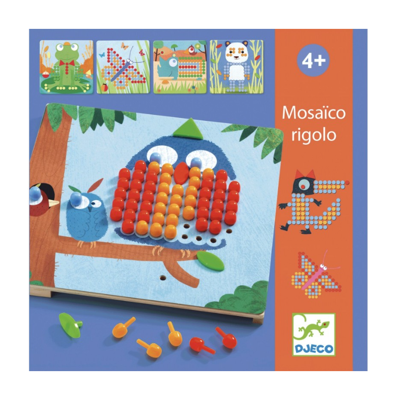 Avec Mosaïco rigolo de Djeco, crée de fabuleux tableaux en complétant les 8 dessins avec les pions de couleur.