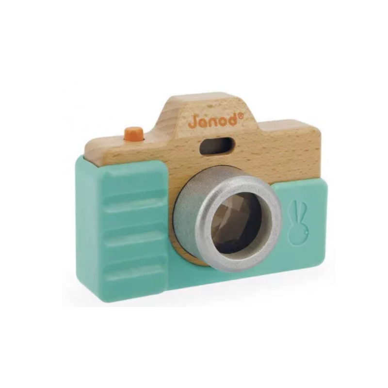 Découvrez l'appareil photo sonore de Janod, un appareil photo en bois pour faire comme les grands avec un kaléidoscope et un bouton déclencheur qui imite le vrai son de l'appareil photo. Un jouet d'éveil en bois protégé dans une coque en silicone pour les enfants dès 18 mois.