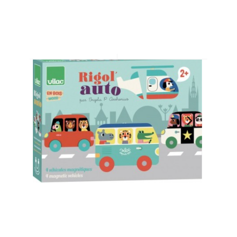 Découvrez le jeu de construction en bois magnétique Rigol'Auto de la marque Vilac! Un total de quatre véhicules aimantés en bois à recomposer avec 12 éléments aimantés - illustrés par Ingela P. Arrhénius.