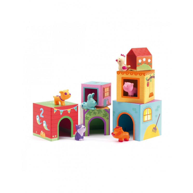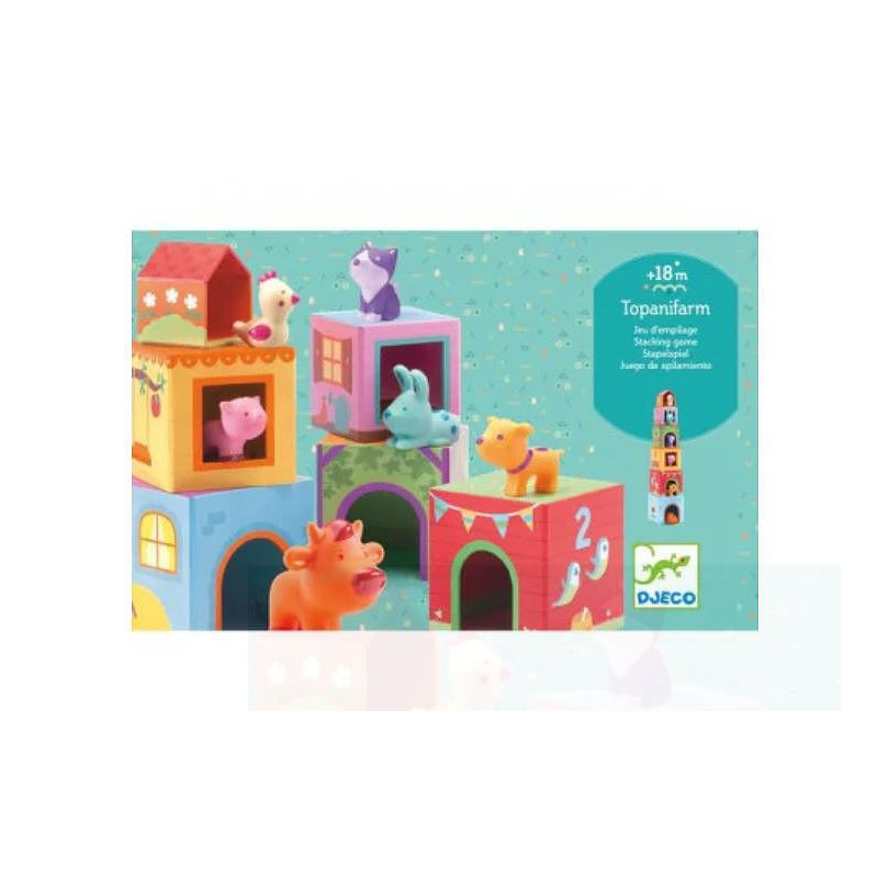Découvrez Topanifarm de Djeco, un coffret composé de cubes et des personnages destiné aux enfants dès 18 mois. Ce jeu comprend 6 cubes maisons colorés en carton et 6 animaux de la ferme en plastique souple : poule, cochon, chien, lapin, chat et vache.