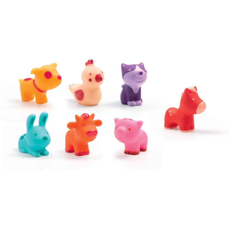 Ce tube comprend 7 animaux de la ferme en plastique souple et très colorés : poule, cochon, chien, lapin, vache, chat et cheval.