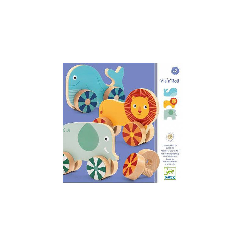 Découvrez le jeu de vissage qui roule Vis'n'roll de Djeco, un jouet d'éveil en bois à partir de 2 ans qui va développer la motricité de votre enfant en créant 3 animaux rigolos, un lion, un éléphant et une baleine.