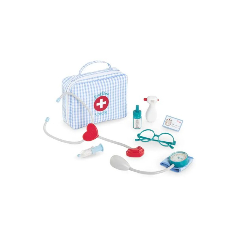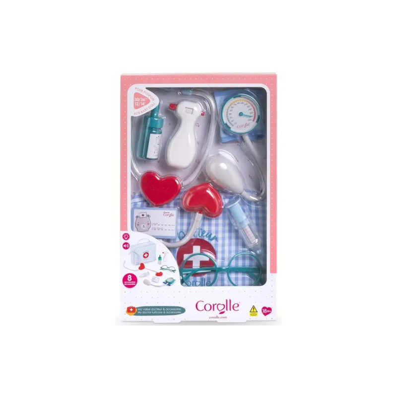 Le Coffret Docteur de la marque Corolle est fait pour ausculter et soigner son grand poupon de 36 cm. Il comprend un stéthoscope qui simule les battements du cœur, une seringue rétractable pour faire des piqûres, un flacon de vitamines, un tensiomètre pour surveiller la tension, un plâtre de bras pour les gros bobos, un thermomètre pour prendre la température de son poupon et une mallette pour tout ranger.