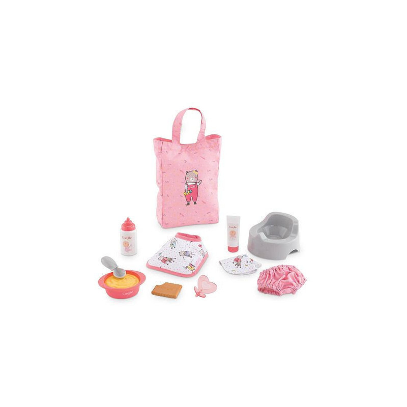 Le Grand Coffret d'Accessoires : contient 11 accessoires indispensables pour s'occuper de son petit poupon : un pot, un tube de crème, une lingette, une tétine, une couche en tissu, une cuillère, une assiette de purée, un biscuit, un biberon, un bavoir et un tote bag pour tout ranger. Produits factices.
