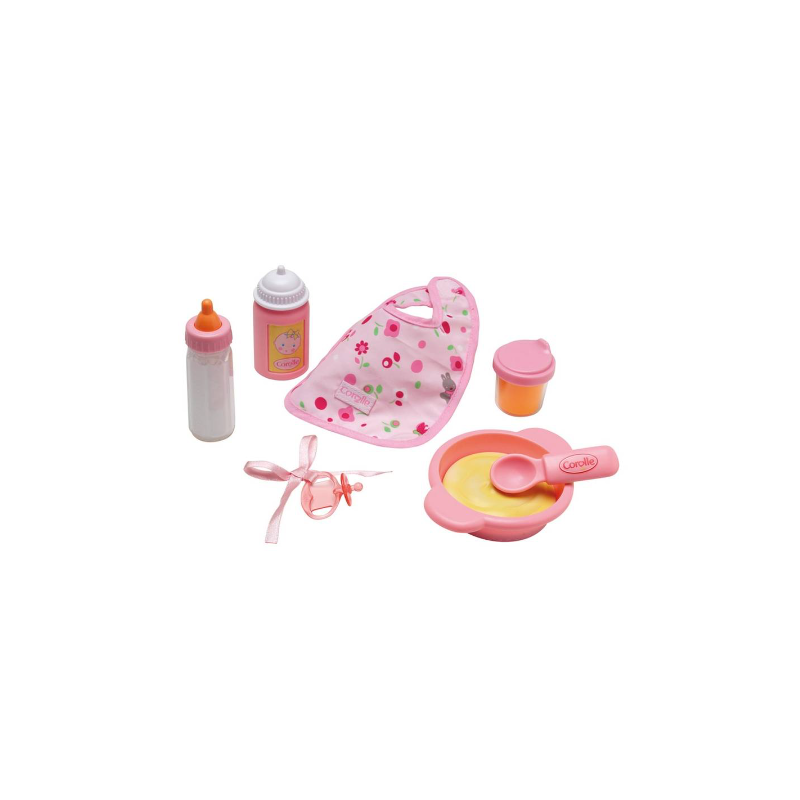 Découvrez Mon 1er coffret repas de Corolle. Cet ensemble repas corolle est composé de 6 accessoires pour un poupon de 30 cm: un bavoir, une tétine, un biberon, une cuillère, une assiette et un verre.
