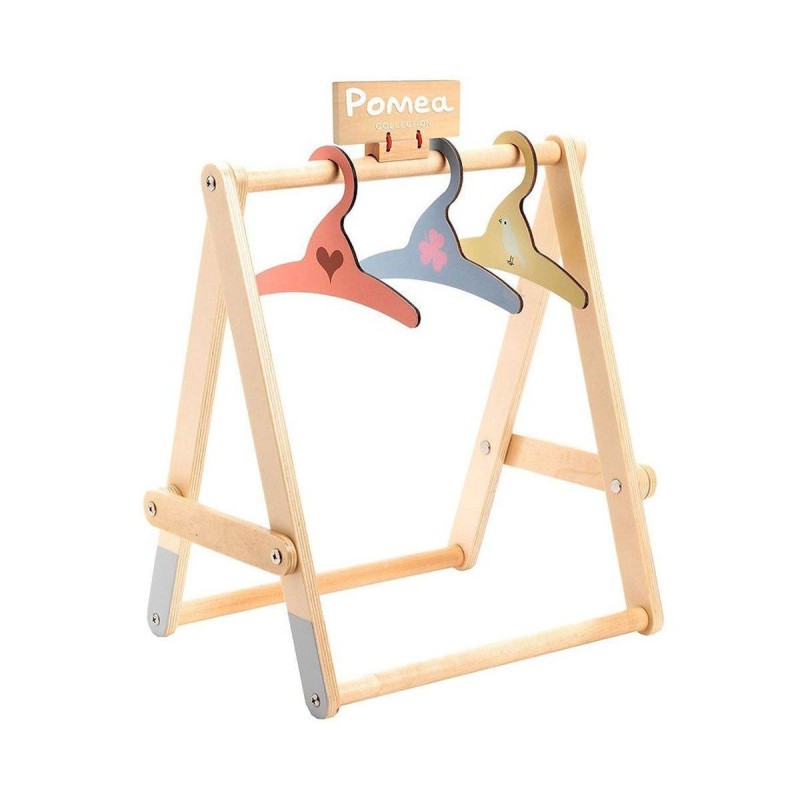 Un porte-vêtements POMEA en bois pour suspendre les habits des poupées sur les trois cintres colorés. Des vêtements bien rangés et c'est une tenue choisie facilement pour que votre poupée soit la plus chic.