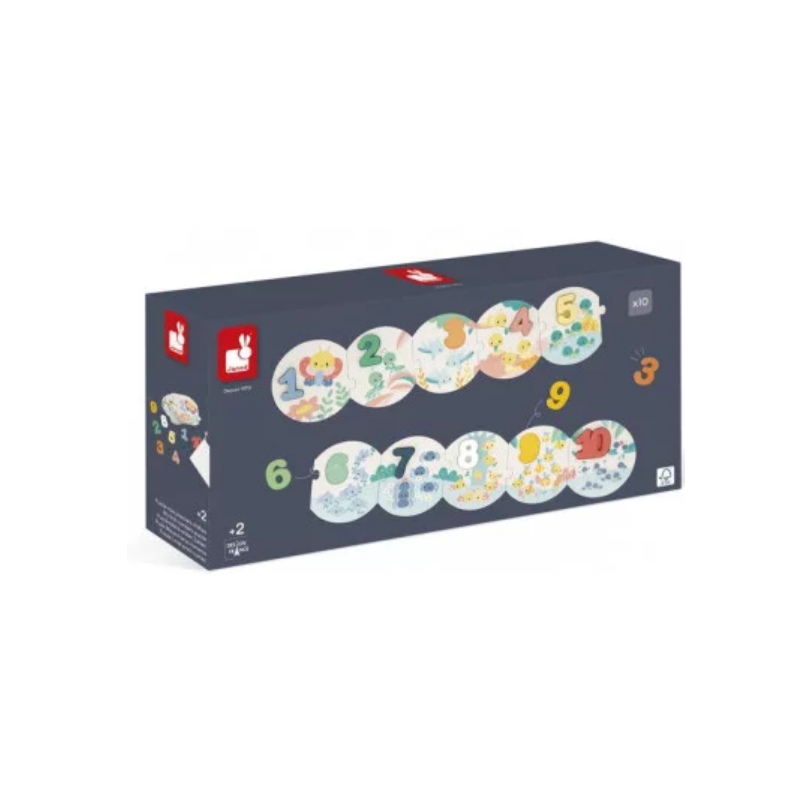 Découvrez le puzzle Mes premiers chiffres de la collection Pure de Janod, un puzzle éducatif composé de 10 pièces en carton et de 10 lettres en bois permettant aux enfants dès 2 ans d'apprendre à compter jusqu'à 10.