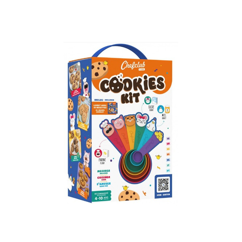 Découvrez le Kit Cookies avec tasses de Chefclub Kids, un coffret comprenant un lot de cuillères colorées et un livre de recettes permettant aux enfants d'apprendre à cuisiner facilement dès 4 ans.