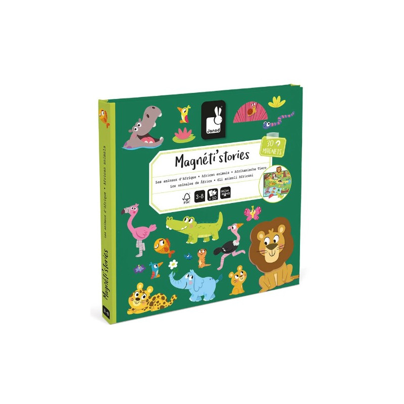 Découvrez le Magnéti'stories Les animaux d'Afrique de Janod, un jeu magnétique dans lequel les enfants dès 3 ans, vont s'amuser à imaginer des scènes grâce à des magnets représentant des animaux sauvages.