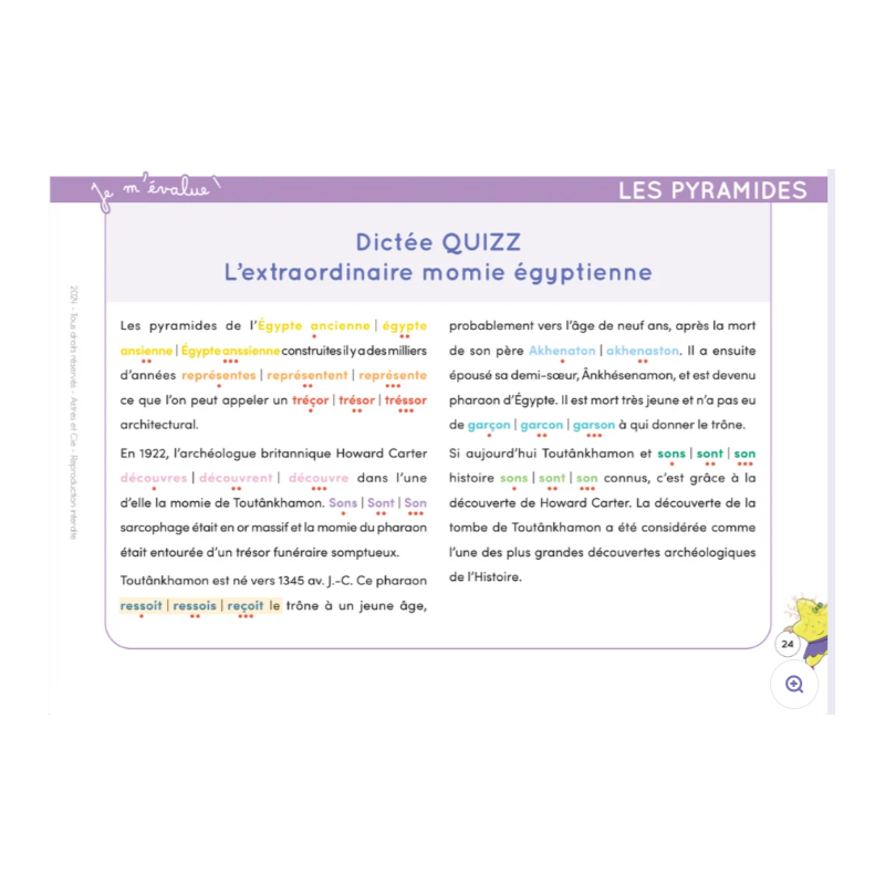 Pour chaque thématique, vous trouverez 2 dictées à choix-multiples à faire sur l’Etoilium, 1 dictée audio à écouter et rédiger en toute autonomie, accompagnée si besoin d’un texte à trou téléchargeable pour la réaliser. Ces 60 dictées préparées sont toutes précédées de fiches progressives d’orthographe, grammaire ou conjugaison et permettront une révision en profondeur de chacune des notions.