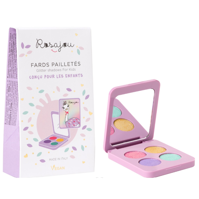 Voici les 4 Fards pailletés à paupières de Rosajou. Ils sont présentés dans boitier miroir spécialement conçu pour les enfants. Formule VEGAN à base de talc et nacres minérales.