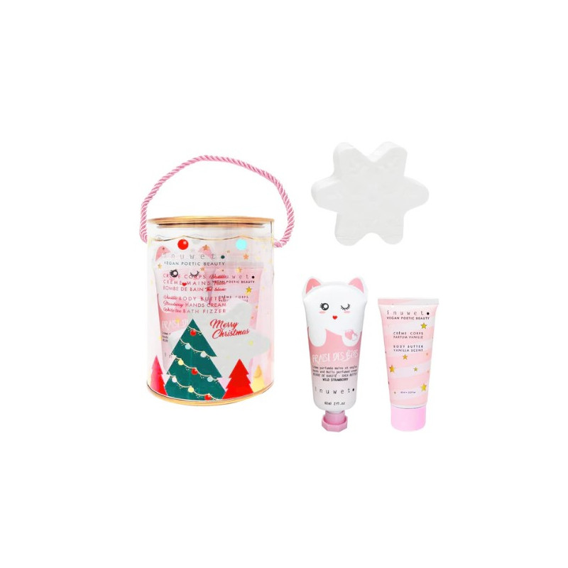 Voici le coffret boule de neige routine soin du corps de Inuwet à emporter partout avec soi, il contient une crème mains hydratante parfum fraise, une crème corps à la vanille et une bombe de bain effervescente en flocon de neige pour un moment magique. Produits véganes.