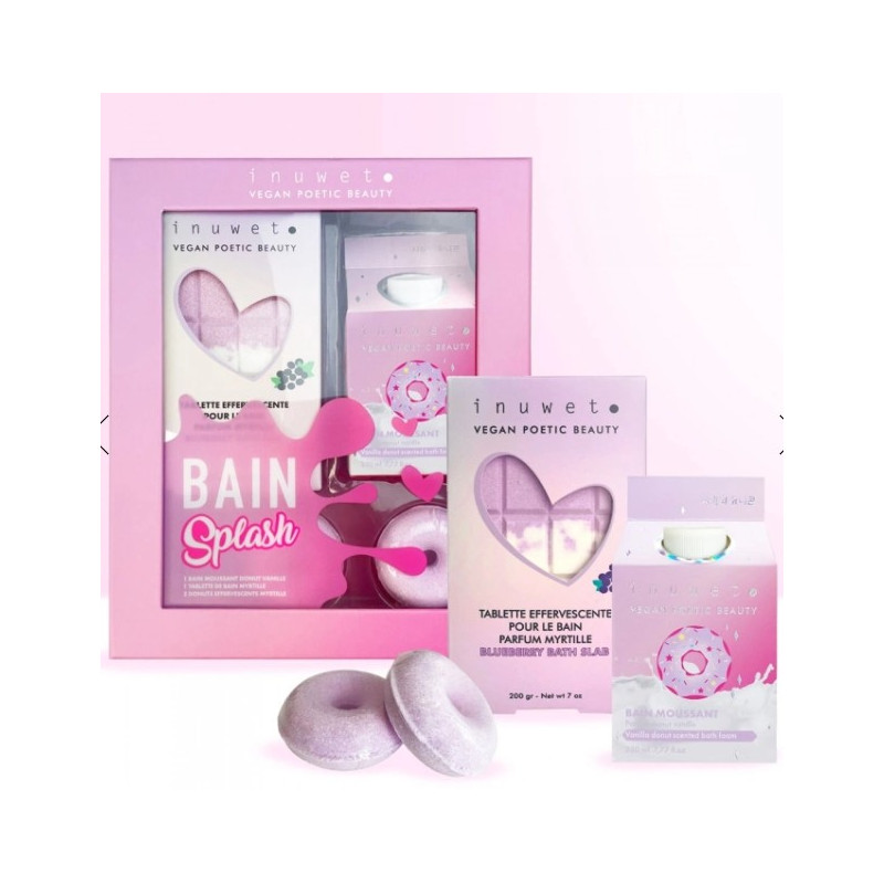 Voici le Coffret Splash pour le bain, composé d'un bain moussant parfum sucré de donuts à la vanille, une tablette de bain effervescente à plonger dans le bain parfum myrtille et deux donuts.