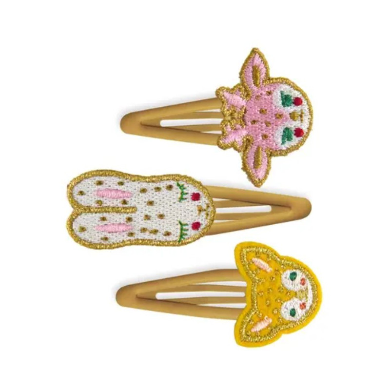 Le set comprend 3 barrettes-clip en métal avec 3 éléments différents : biche, lapin et renard en tissu brodé.