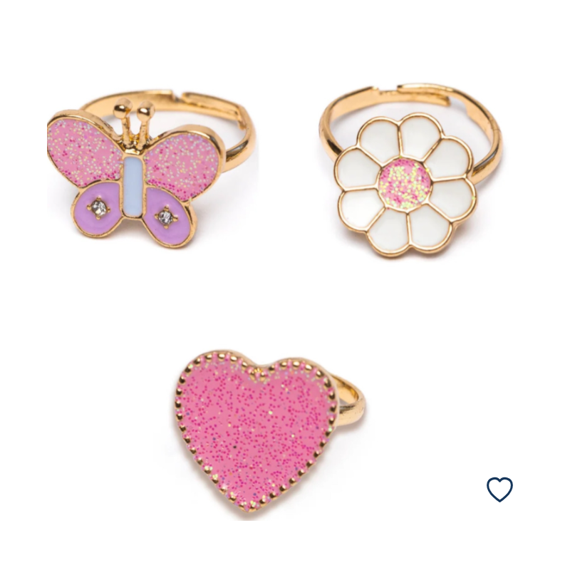 Ajoutez une touche de magie avec le set de 3 bagues Wonderland de Great Pretenders. Trois bagues fantaisie ajustables aux tons rosés, ornées d’une fleur, d’un papillon et d’un cœur étincelant.