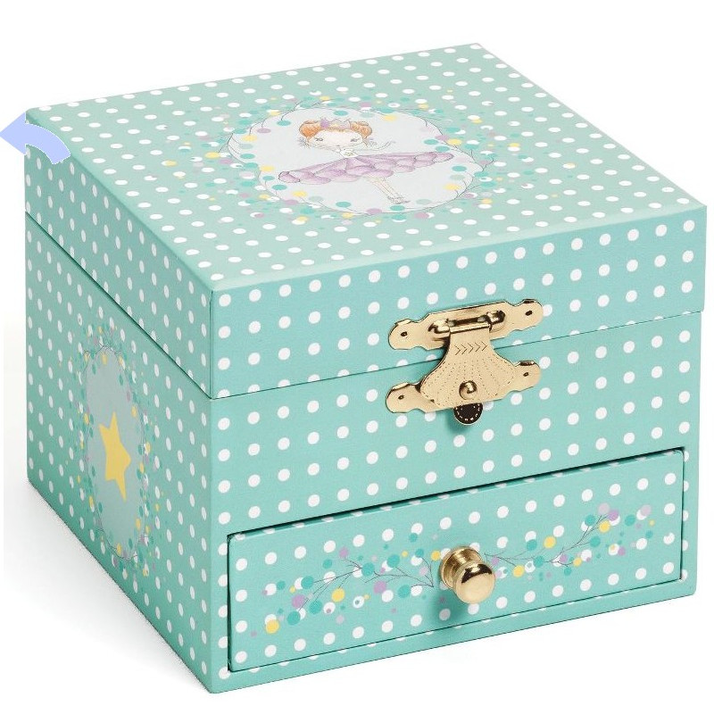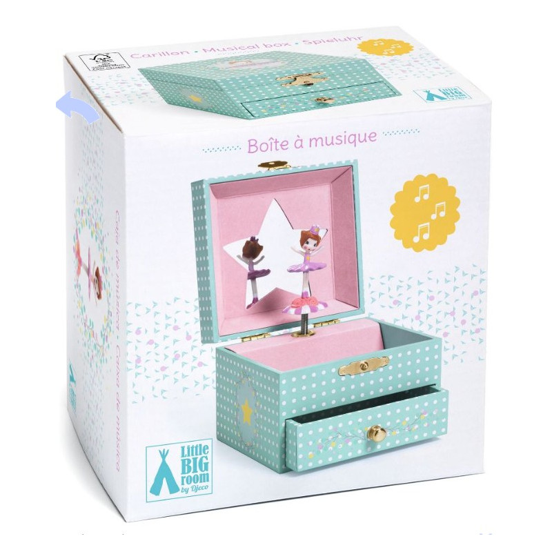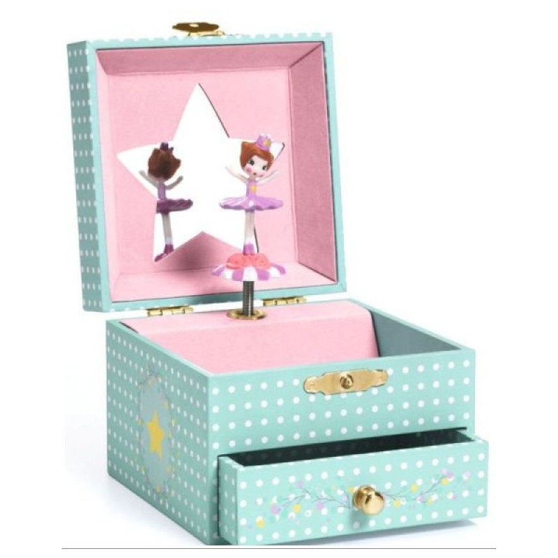 Une petite boite à musique Djeco avec tiroir où une ballerine se mettra à danser lorsque vous actionnerez la musique. Le tiroir et le compartiment lui permettront de ranger bijoux, trésors et secrets ... et de s'admirer dans le petit miroir silhouetté en forme d'étoile devant lequel danse la danseuse.