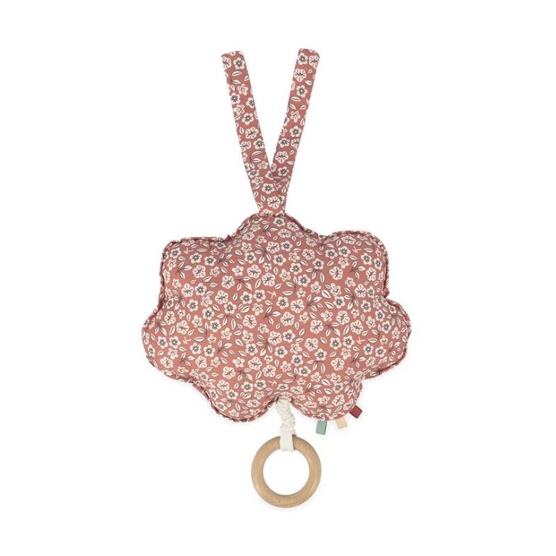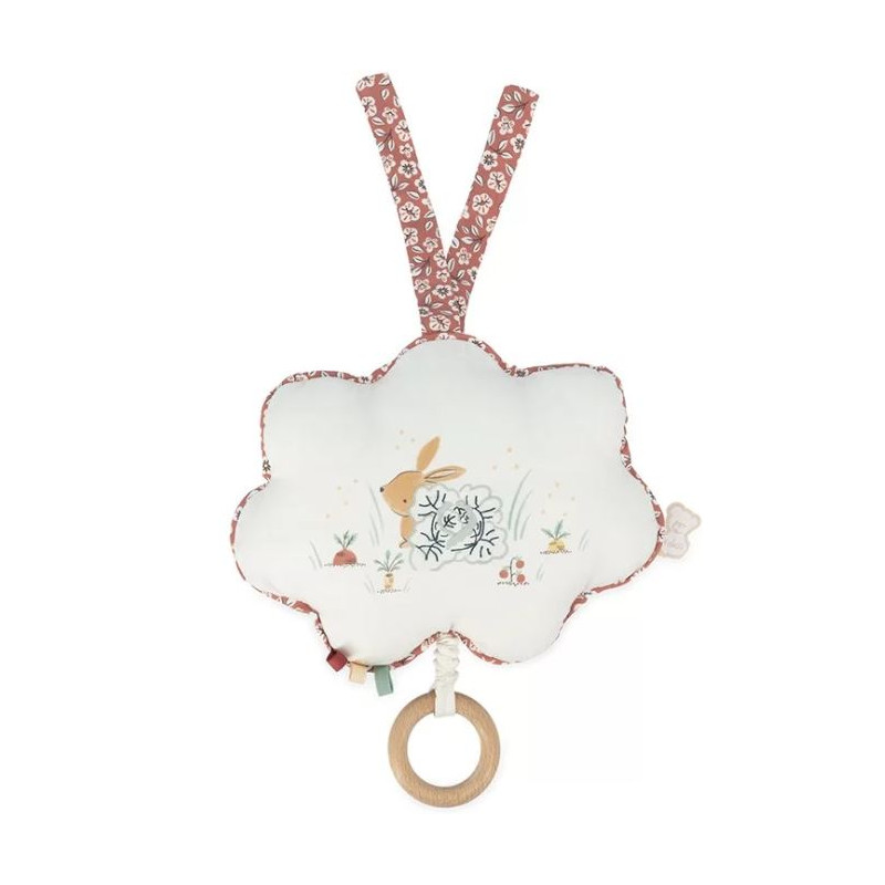 Cette boite à musique en tissu accompagnera bébé tout au long de la journée. Tirez sur l'anneau en bois au bout de la ficelle, vous entendrez la comptine "Mon petit lapin" afin de pouvoir la chanter à bébé. Sa petite taille de 12cm et son ruban permet de l'emporter et l'accrocher partout