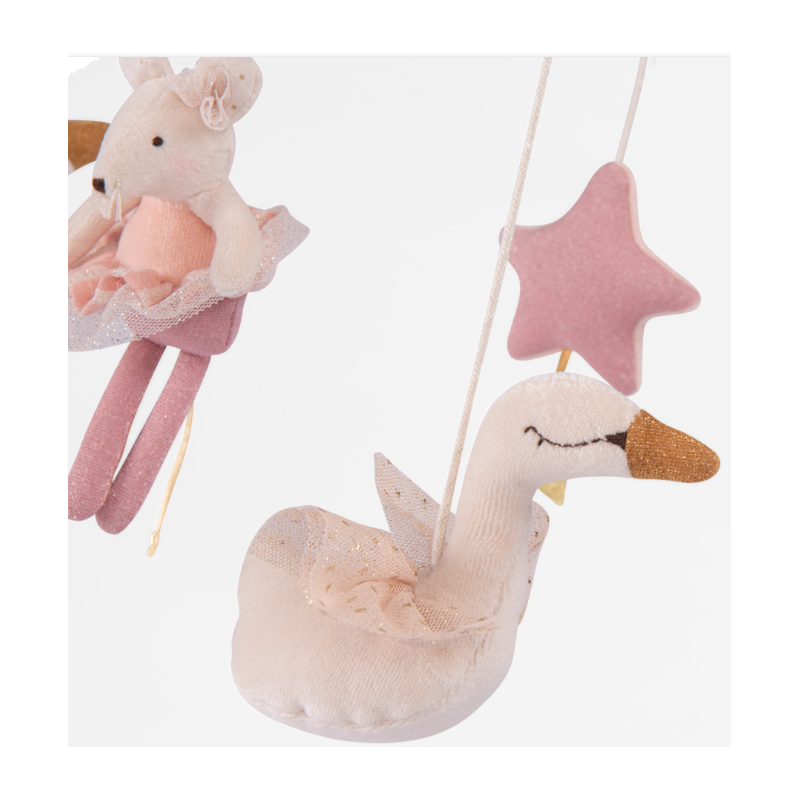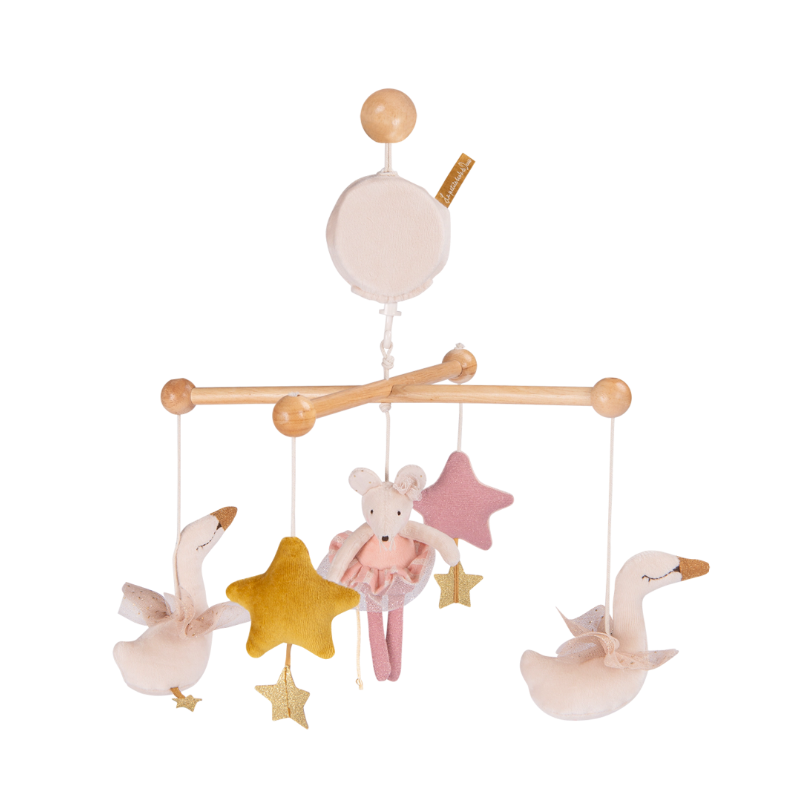 Découvrez le mobile musical La petite école de danse de Moulin Roty: ce mobile musical à la douce mélodie rythmera les périodes d'endormissement de bébé. Sur une structure en bois, une petite souris danse au milieu des cygnes et des étoiles… avant de rejoindre le pays des rêves. Bébé s'en amusera durant ses phases d'éveil.