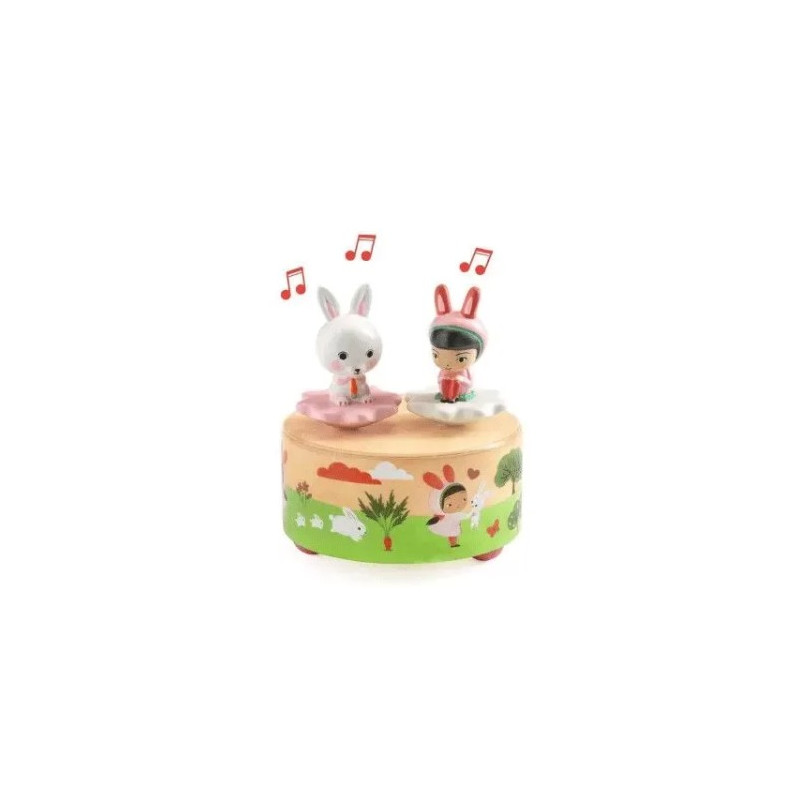 Découvrez la boite à musique Garden Melody de Djeco, une jolie boite à musique ronde en bois avec deux personnages qui tournent pour éveiller ou endormir les bébés.