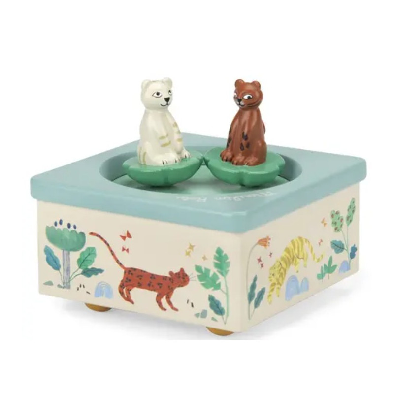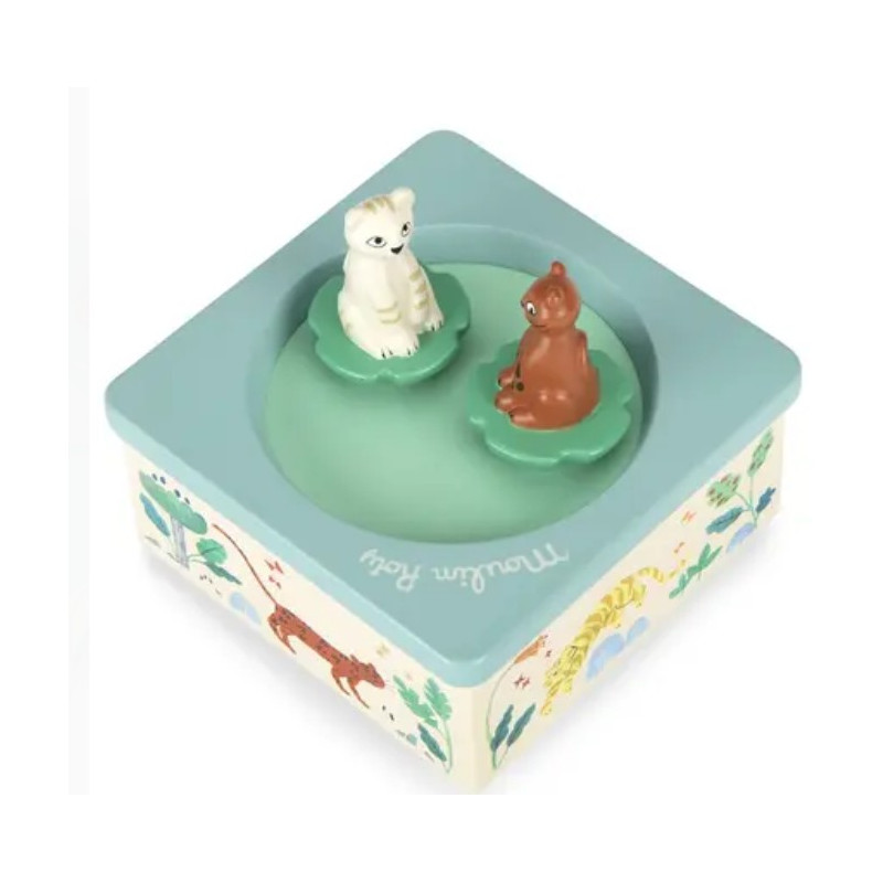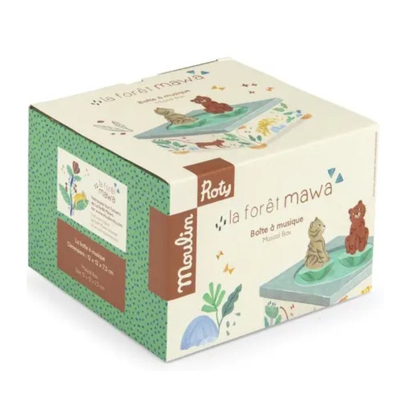 Voici la Boîte à musique La forêt Mawa de Moulin Roty : Baboo et Taïgo virevoltent au rythme de la berceuse pour endormir tendrement votre enfant. La boîte à musique a été joliment illustrée à l'aquarelle par Élodie Coudray.