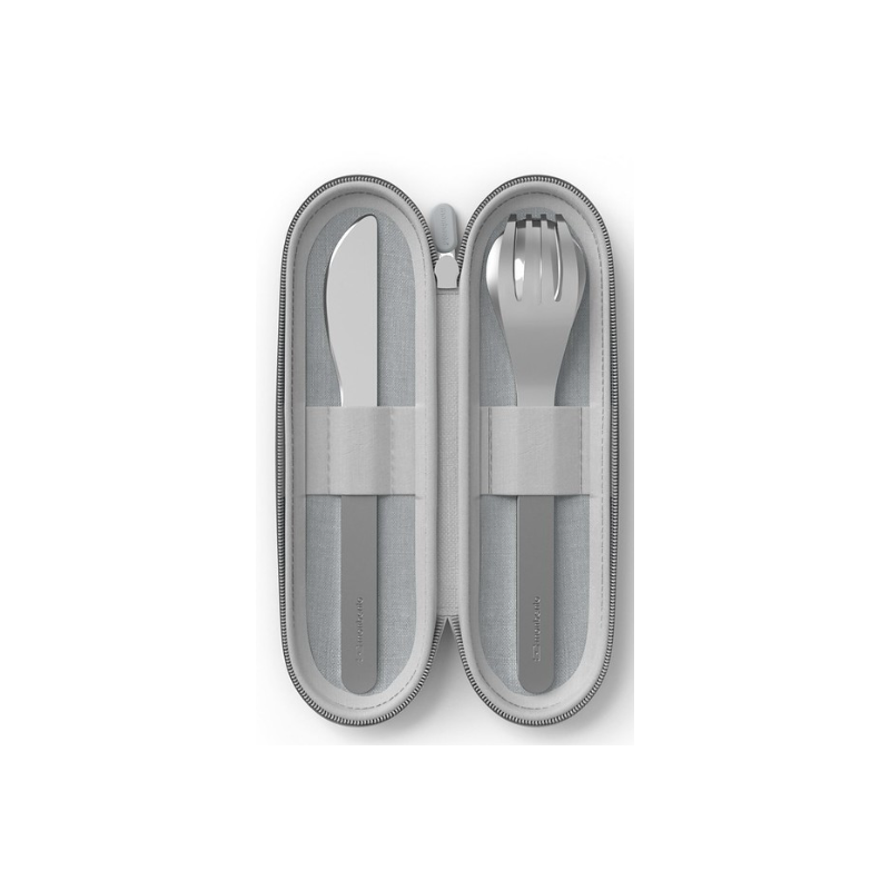 Ces couverts en acier inoxydable viennent compléter la gamme de la marque pour permettre aux personnes de manger facilement en extérieur. Avec leur forme allongée et leur texture facilitant la prise en main, ces couverts nomades ne vous quitteront plus ! Bien rangés dans leur étui en tissu gris, aussi élégant que pratique grâce à son élastique de maintien et sa fermeture éclair, ils sont faciles à transporter.