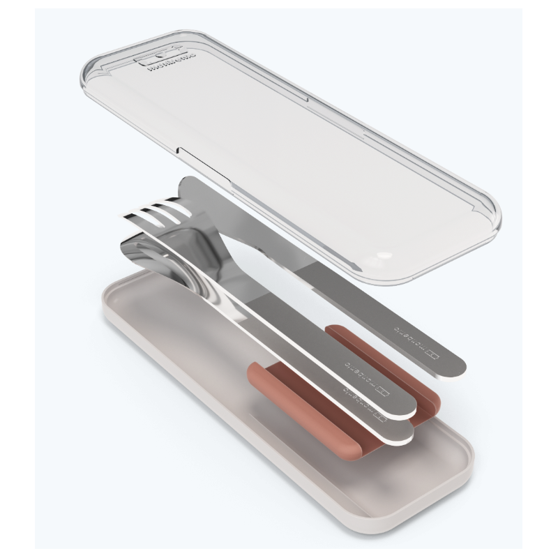 Voici le set de couverts MB Slim box rose moka de Monbento pour permettre aux nomades de manger comme à la maison.