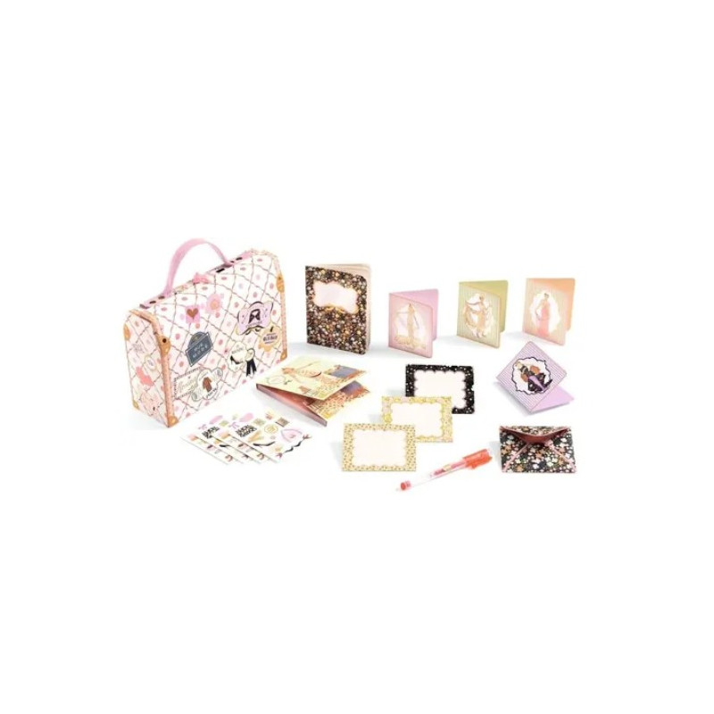 Ce set de correspondance comprend 1 coffret valise, 1 cahier, 1 bloc-notes, 1 stylo gel rose, 4 enveloppes, 4 cartes d'invitation.
