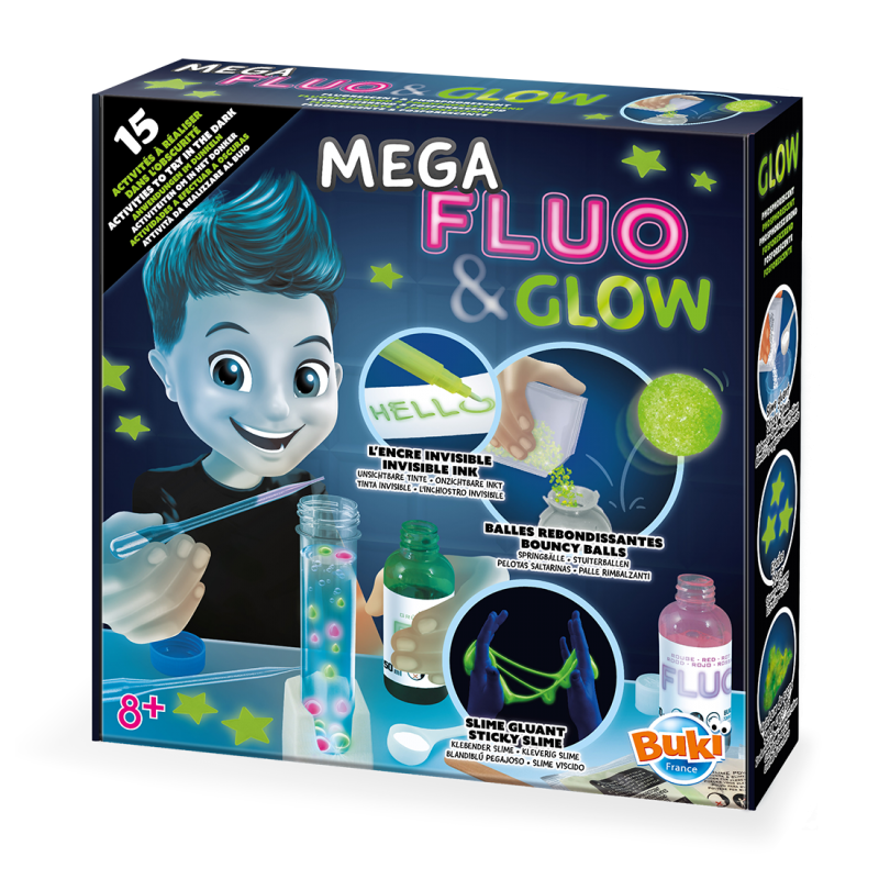 Avec le Kit expérience Mega fluo & glow de Buki, découvre 15 activités à réaliser dans l'obscurité. Allume la lampe à UV pour admirer les colorants fluorescents. Fabrique du slime et des balles rebondissantes phosphorescentes qui brillent la nuit.