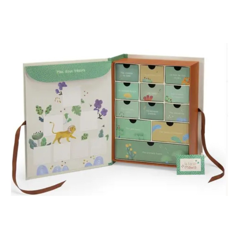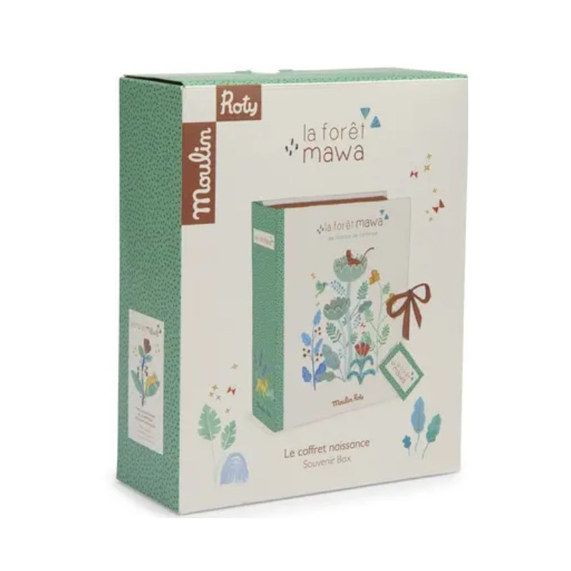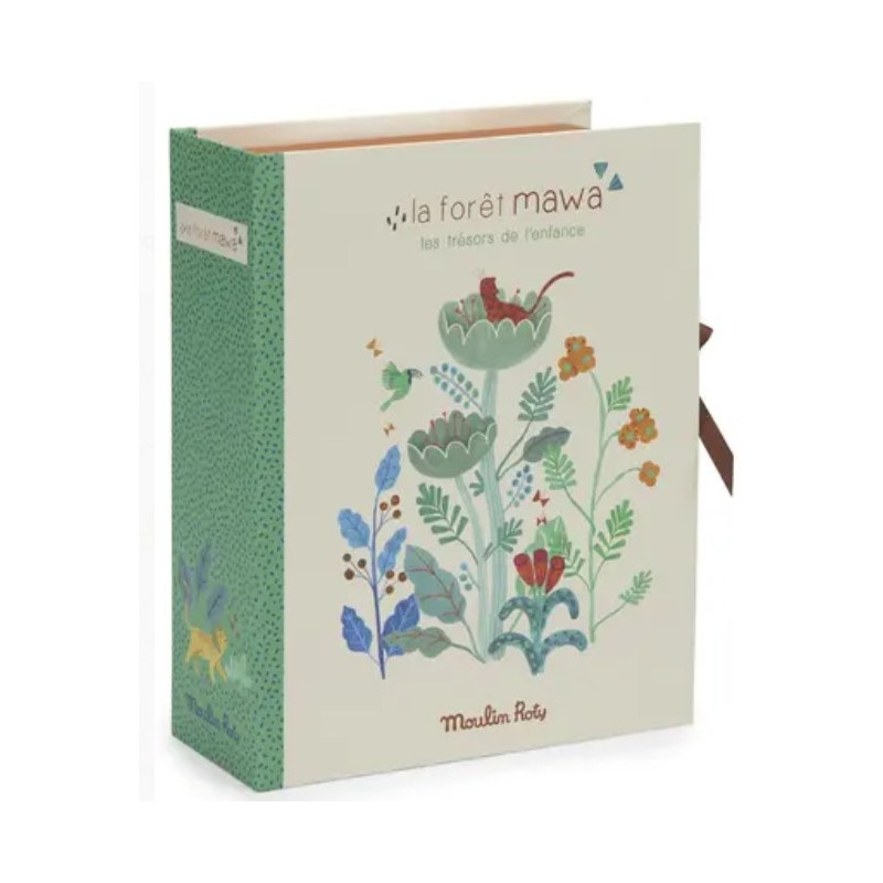 Voici le Coffret Coffret naissance La forêt Mawa de Moulin Roty, un coffret à trésors rigide pour conserver précieusement tous les trésors de l'enfance dans ses petits tiroirs. Se referme avec des liens et reprend les délicates illustrations des personnages de la forêt Mawa signées Élodie Coudray.