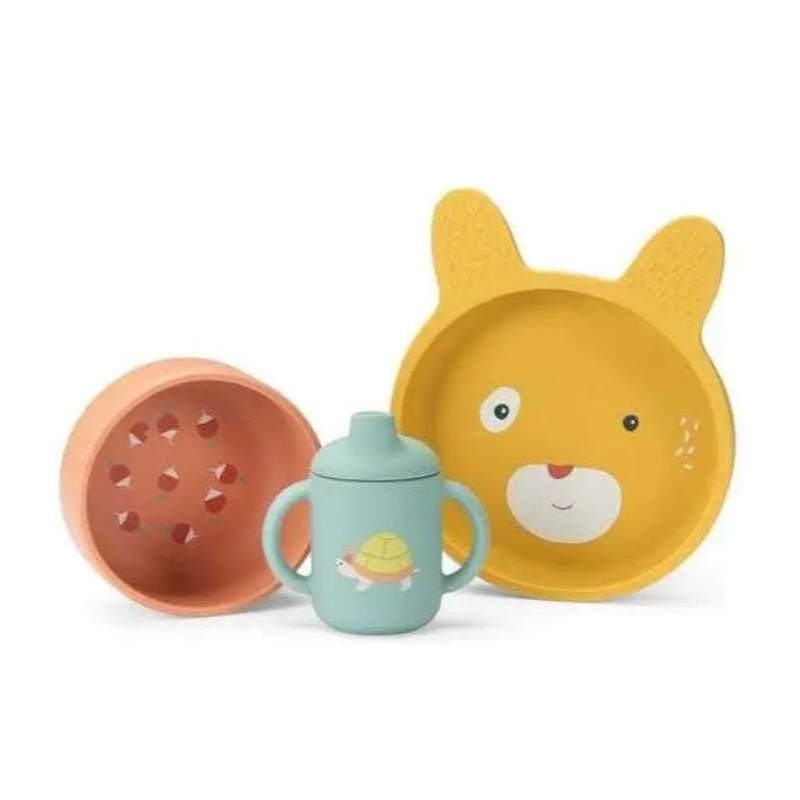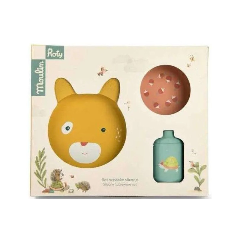 Découvrez le set de vaisselle en silicone de la collection Trois Petits Lapins de Moulin Roty, un coffret vaisselle tendre et ludique, parfait pour accompagner bébé dans l’étape importante de la diversification alimentaire.