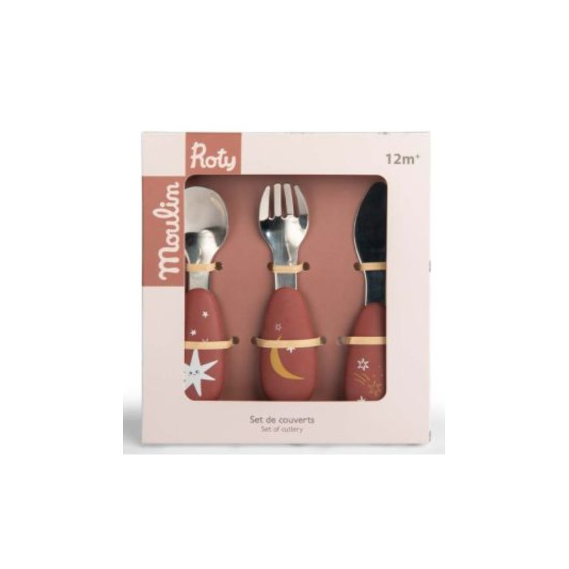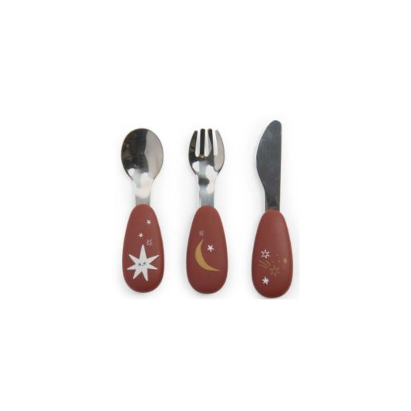 Le set contient une cuillère, une fourchette et un couteau à bout rond, parfaitement adaptés aux petites mains. Chaque couvert est joliment illustré aux couleurs de la collection, avec de jolies étoiles et une lune.