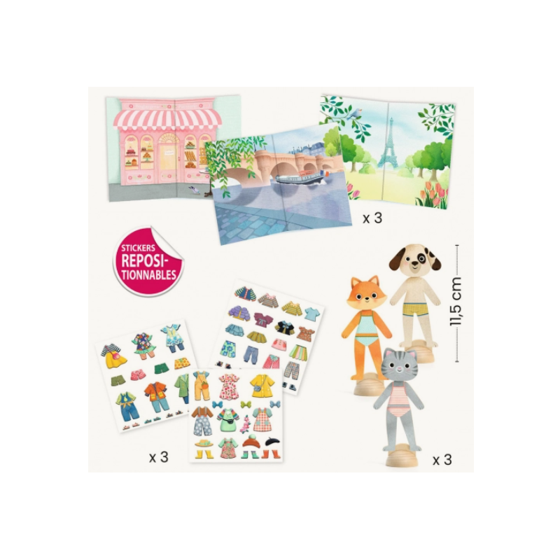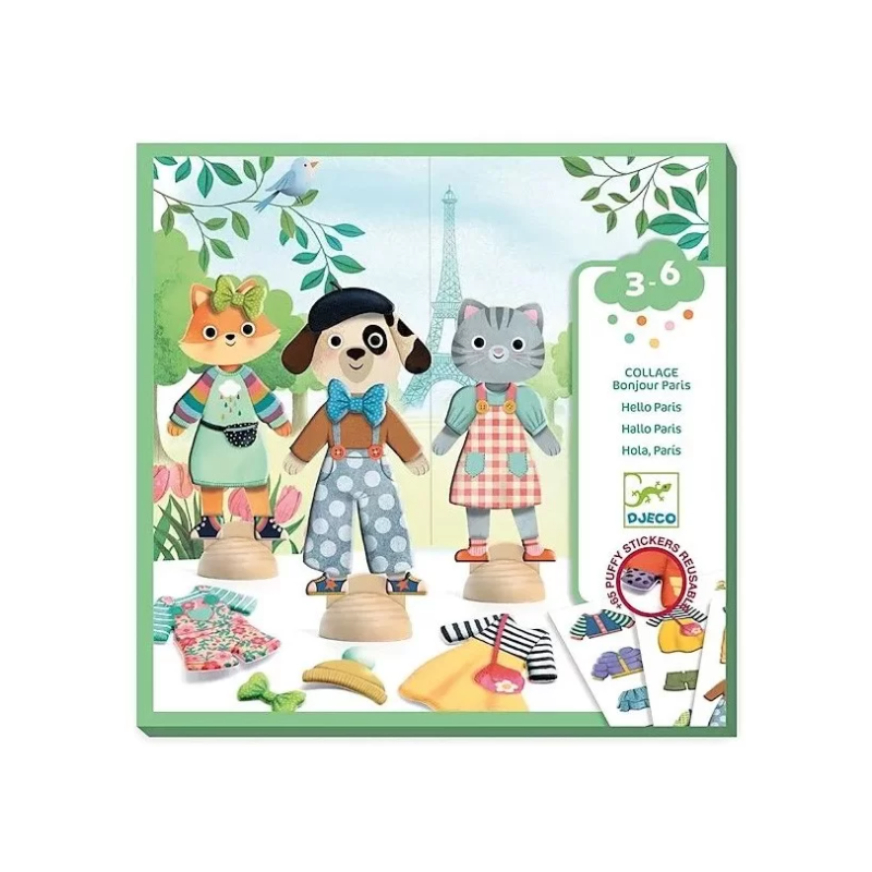 Découvrez le coffret Collage Bonjour Paris de Djeco, une activité de collage dans laquelle les enfants, de 3 à 6 ans, vont habiller 3 adorables personnages en bois avec plus de 45 habits.