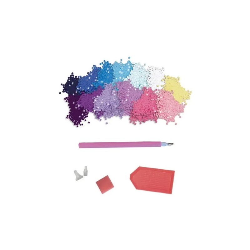 Ce coffret permet ainsi de décorer 1 tableau à l’aide de mini-strass de couleurs variées. L’enfant commence par verser les mini-strass dans le plateau rainuré pour les aligner et faciliter leur manipulation. Il prépare ensuite le stylet en appuyant sa pointe dans le carré de gomme : cela dépose une petite quantité de matière qui rend la pointe légèrement collante.