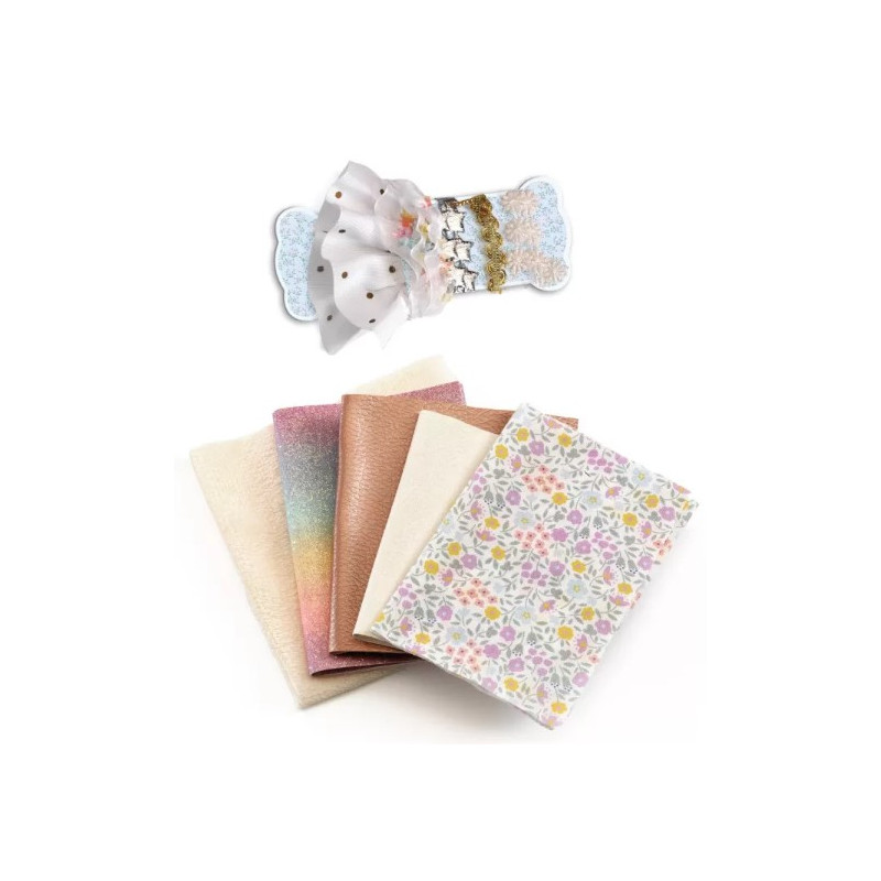 3 poupées, 3 socles en bois, 1 tissu imprimé, 4 tissus de matières variées, 5 galons ou rubans, 2 fils élastiques, un sachet de perles et petits accessoires, 1 planche de strass autocollants, 1 paire de ciseaux, 1 rouleau d'adhésif double-face, 1 stylo, 3 planches de patrons