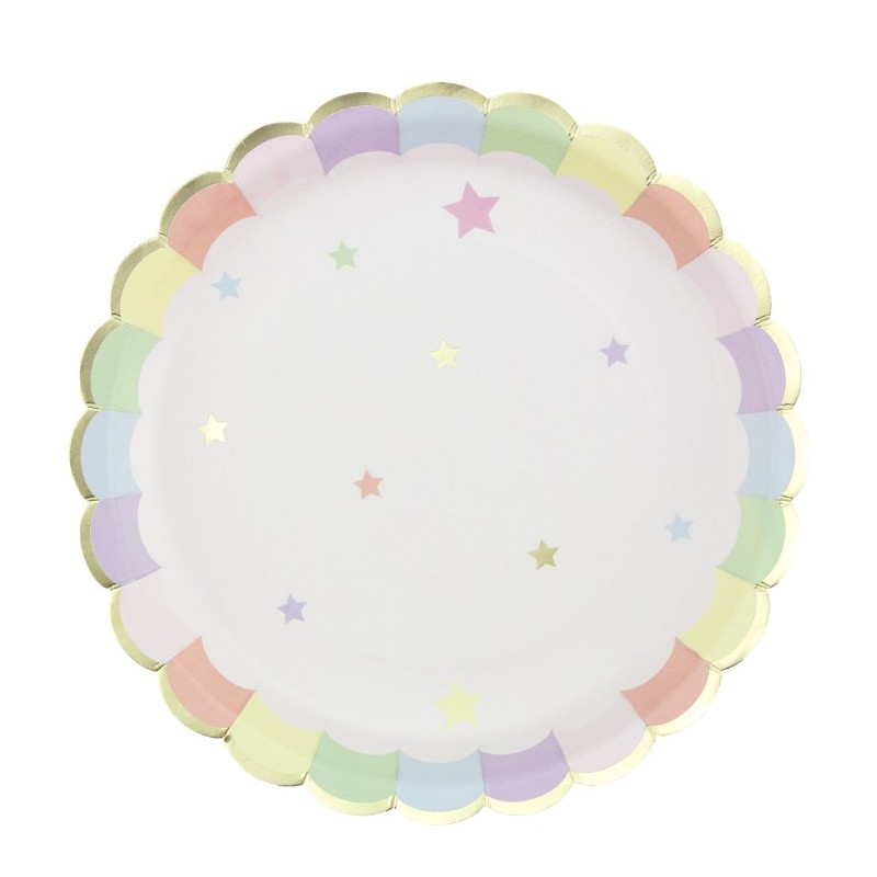 Sachet de 8 jolies assiettes rose pastel festonnées festonnées avec un galon doré, motif multicolore étoilé de Tim & Puce Factory.