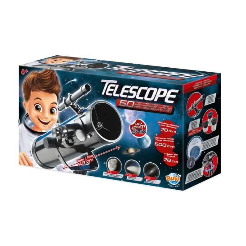 Découvrez le télescope réflecteur de Buki, il est fourni avec une notice de 50 activités pour découvrir le ciel étoilé, les planètes et les cratères lunaires.