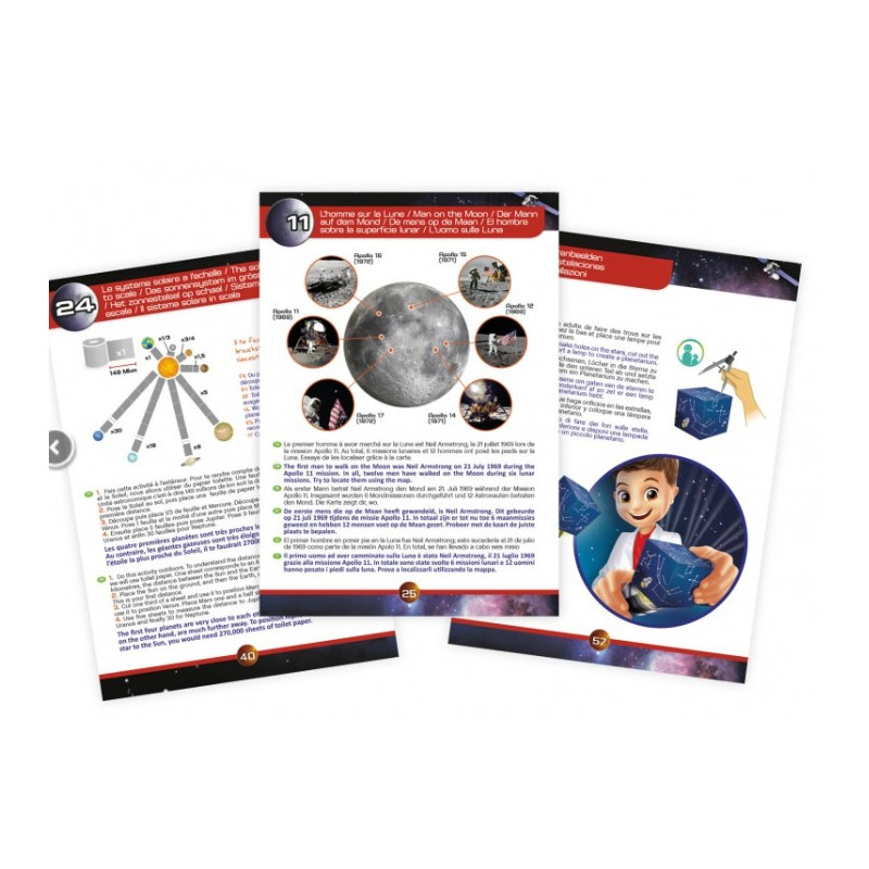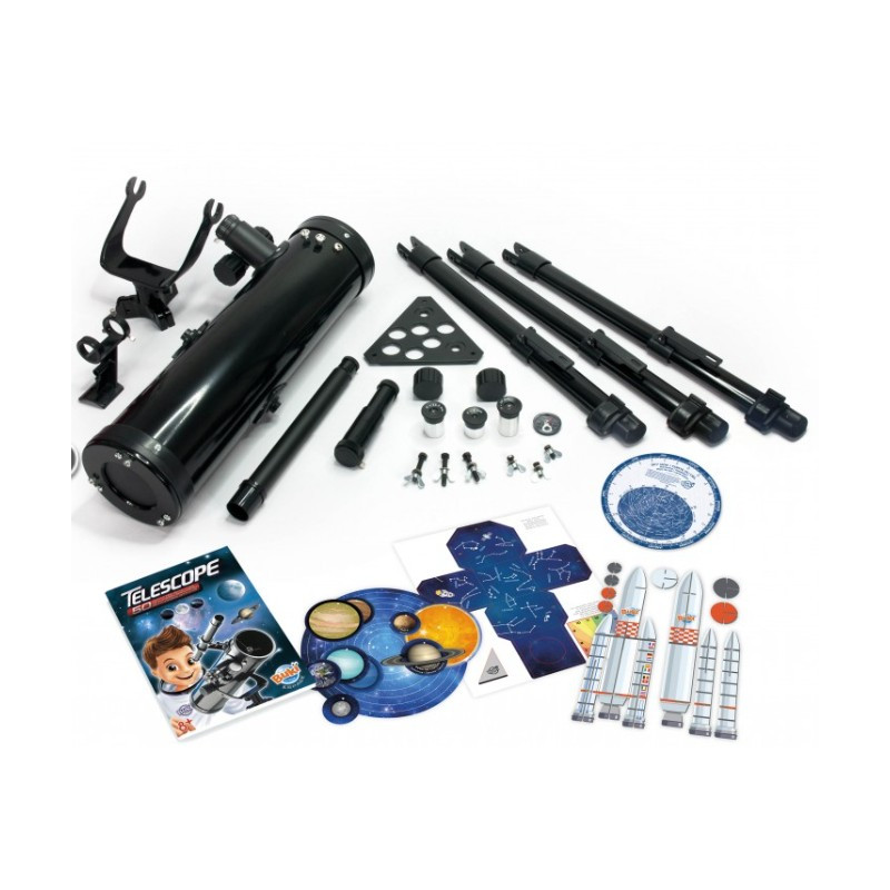 Inclus : 1 tube, 1 trépied, 1 monture, 1 grande vis, rondelles et écrous papillon (x3), 1 petite vis, rondelles et écrous papillon (x3), 1 vis de la monture (x2), 1 plateau, oculaires (20 mm / 12.5 mm/4 mm), 1 lentille de Barlow, 1 chercheur, 1 support du chercheur, 1 carte du ciel, 1 boussole, cartes prédécoupées, 1 notice illustrée avec 50 activités.