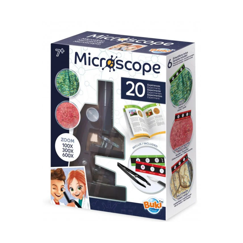Avec le microscope Buki et ses 20 expériences, découvre la beauté époustouflante du monde de l'incroyablement petit grâce au matériel fourni.
