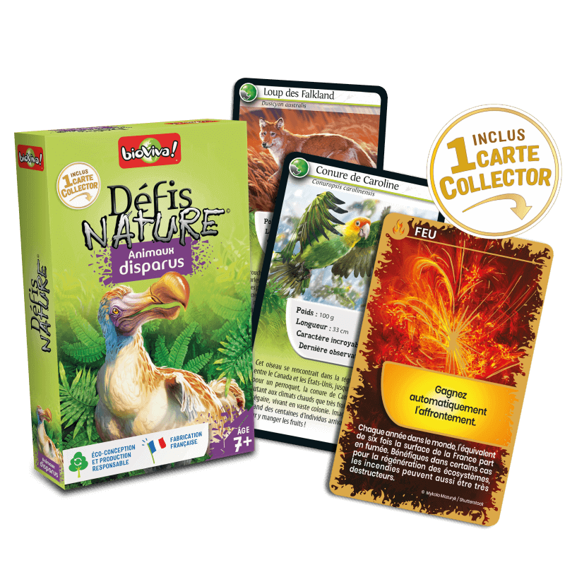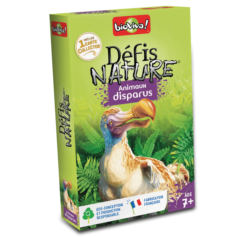 Découvrez Défis nature Animaux disparus de Bioviva, un jeu de cartes éducatif à partir de 7 ans, qui vous emmène à la rencontre des animaux récemment disparus.