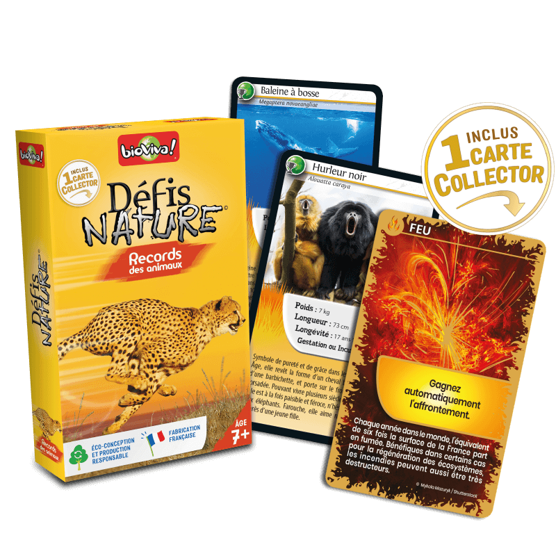 Découvrez Défis nature Records des animaux de Bioviva, un jeu de cartes éducatif à partir de 7 ans, qui vous emmène à la rencontre des animaux aux records les plus surprenants.