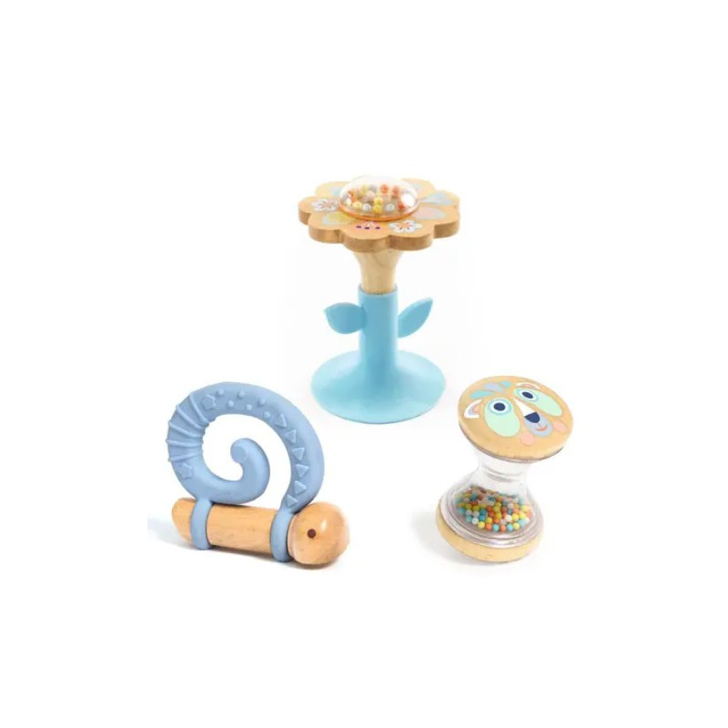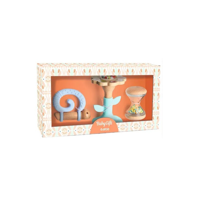 Grâce à ce joli coffret, votre bébé pourra soulager ses poussées dentaires grâce à l'anneau de dentition en forme d'escargot, un jouet en bois et silicone souple qui se tient debout. Bébé pourra également jouer avec le hochet BabySabli, un jouet transparent qui permet d'observer le déplacement des billes à l'intérieur.