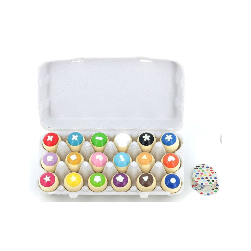 Le jeu contient une boite d’œufs, 18 petits œufs en bois et 18 cartes en forme d’œuf.