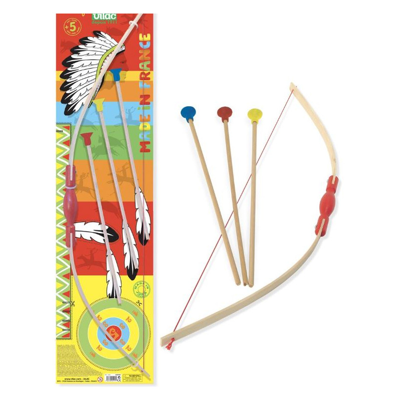 Pour jouer à l'indien, joli arc et ses 3 flèches en bois à embout caoutchouc de Vilac , livrés dans une boîte servant de cible (2 cibles à découper). L'arc à monter mesure 91cm de long.