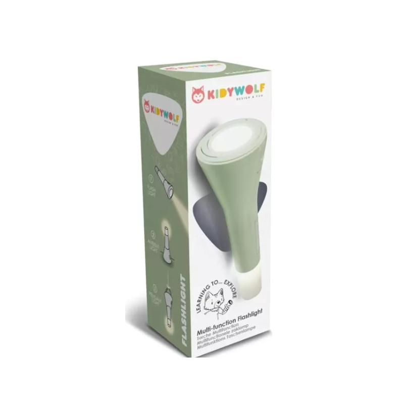 Découvrez la Lampe de poche vert multi-fonction Kidytorche de Kidywolf, un accessoire ludique conçu pour explorer dans l'obscurité, rassurer vos enfants pendant la nuit et éloigner les monstres.