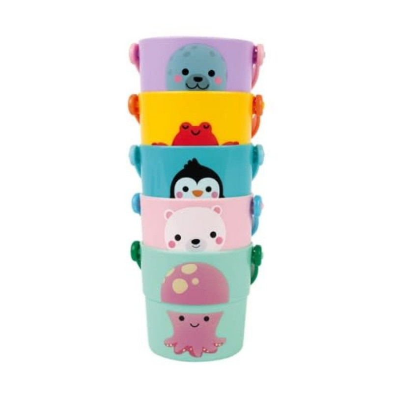 5 seaux d’activités pour jouer dans le bain et à emmener partout ! Remplis tes seaux d’eau ou de mousse et soulève-les le plus haut possible pour regarder l’eau s’écouler grâce aux différents trous.