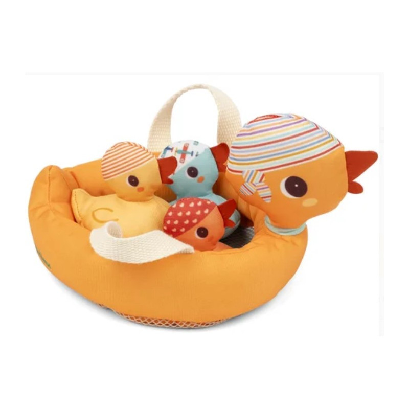En tissu, la grande maman canard flotte sur l'eau et peut porter ses canetons sur son dos en forme de filet ou les laisser nager librement.