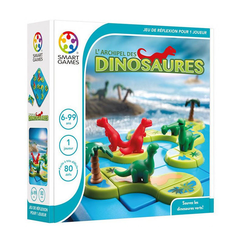 Découvrez le jeu l'archipel des dinosaures de SmartGames, un jeu de logique et de réflexion pour les enfants dès 6 ans avec 80 défis à réaliser pour recréer le monde du jurassique.