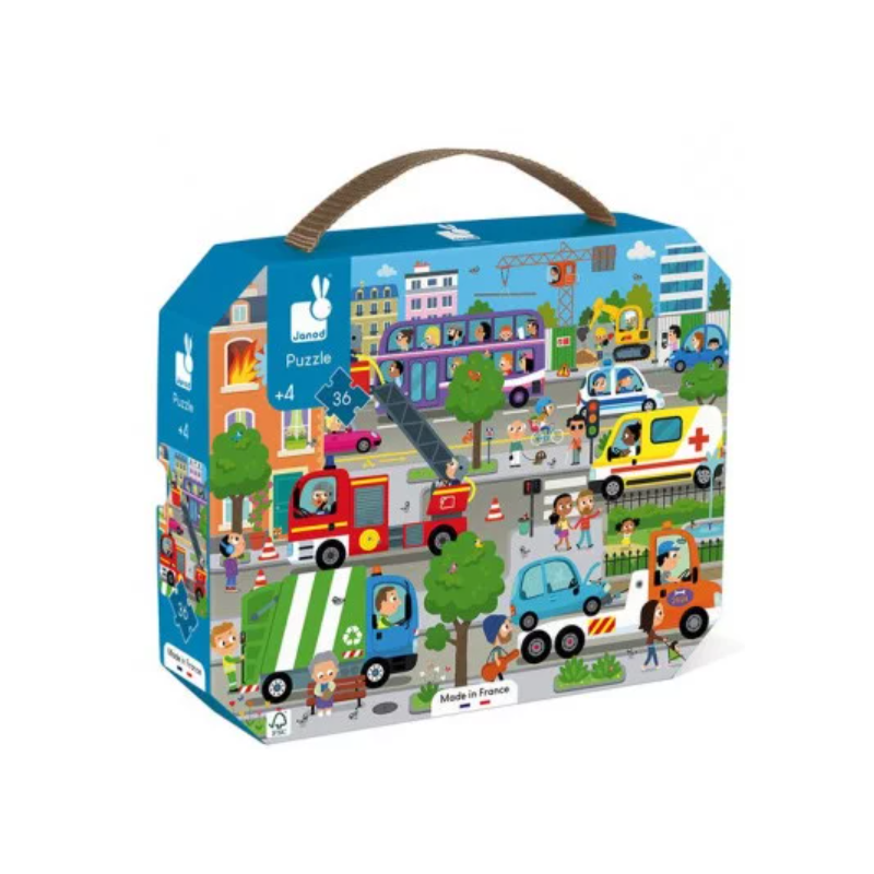 Découvrez le puzzle city de Janod, un magnifique puzzle de 36 pièces en carton pour les enfants sur le thème de la ville à partir de 4 ans. Un puzzle fabriqué en France avec une superbe illustration dans une ville avec des véhicules et des personnages.