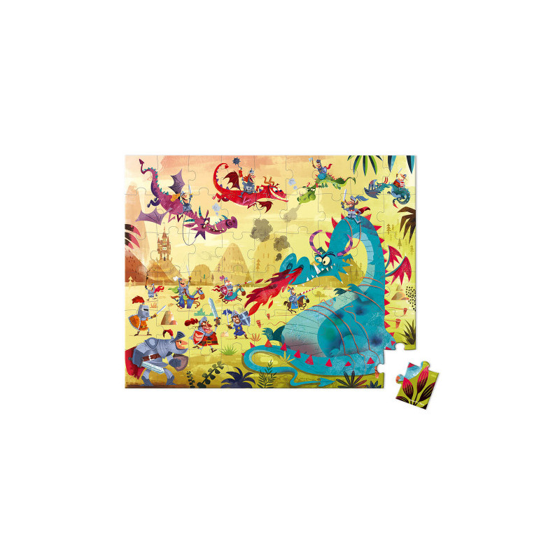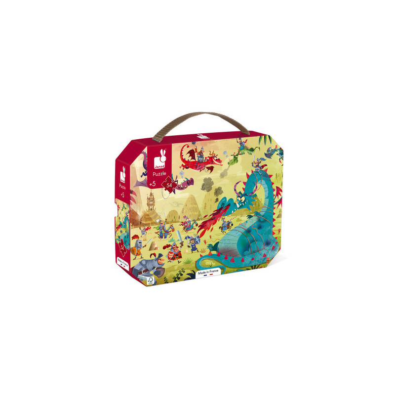 Découvrez le puzzle dragons de Janod, un magnifique puzzle de 54 pièces en carton pour les enfants à partir de 5 ans qui aiment les histoires de dragons et de chevaliers.